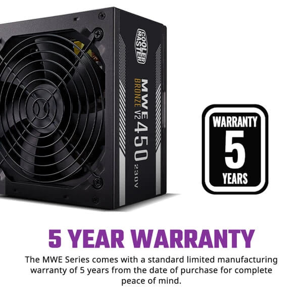 The many processes required by a power supply unit in order to take power directly from the wall or other fixed power source, convert it to the correct output required by the connected components, and then distribute that power to said components safely can be full of risks. This is why it's important for a PSU to have the right protections and regulations to ensure this process runs correctly. The MWE Bronze - V2 is a safe, reliable product and as such Cooler Master is happy to offer a standard 5 year manufacturing warranty for all units in the series.