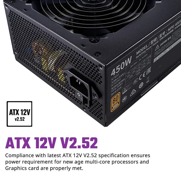 Cooler Master MWE 450 V2 80 Plus Bronze SMPS Power Up, 80 Plus Bronze Certified, 120mm HDB Fan, Single +12V Rail, Flat Black Cables.