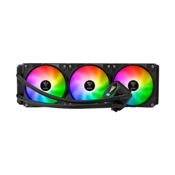 The AURA GL360 is a compact all-in-one RGB liquid cooler equipped with highly efficient PWM fans with hydraulic bearing for better airflow, along with a durable Teflon tube to provide better aesthetics and lasting performance.